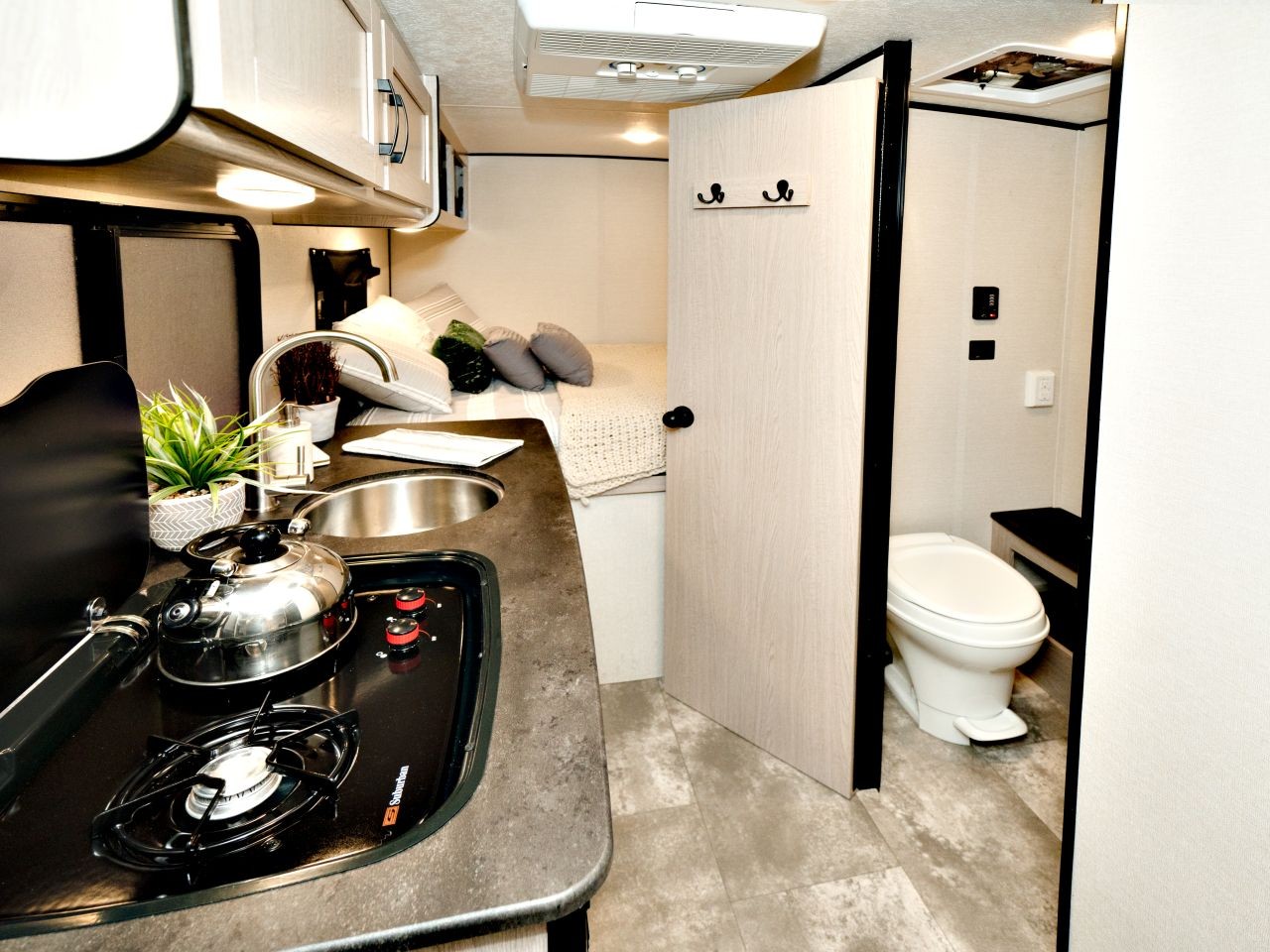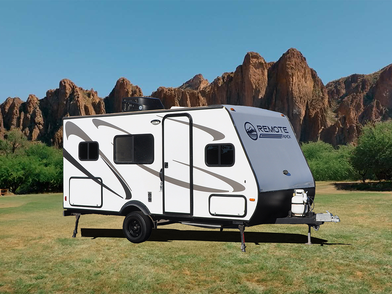 This custom-built trailer allows you to set up camp and use your own vehicle to get in and out of town. It has all the amenities of a motorhome but provides flexibility when you need it.
