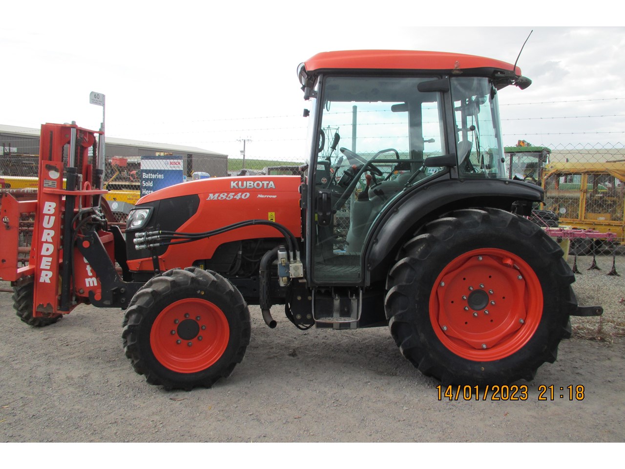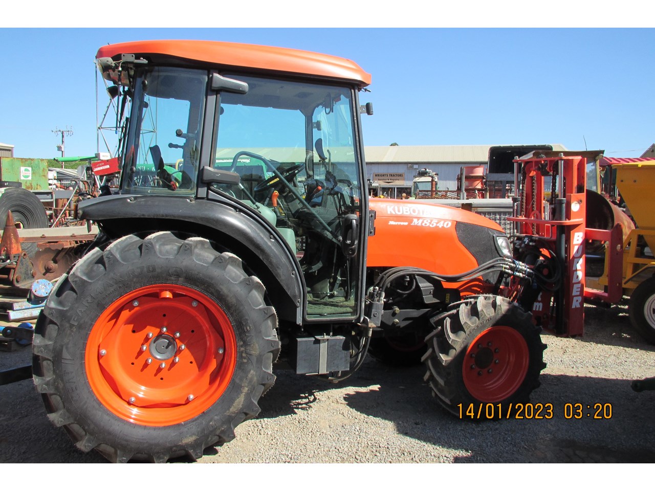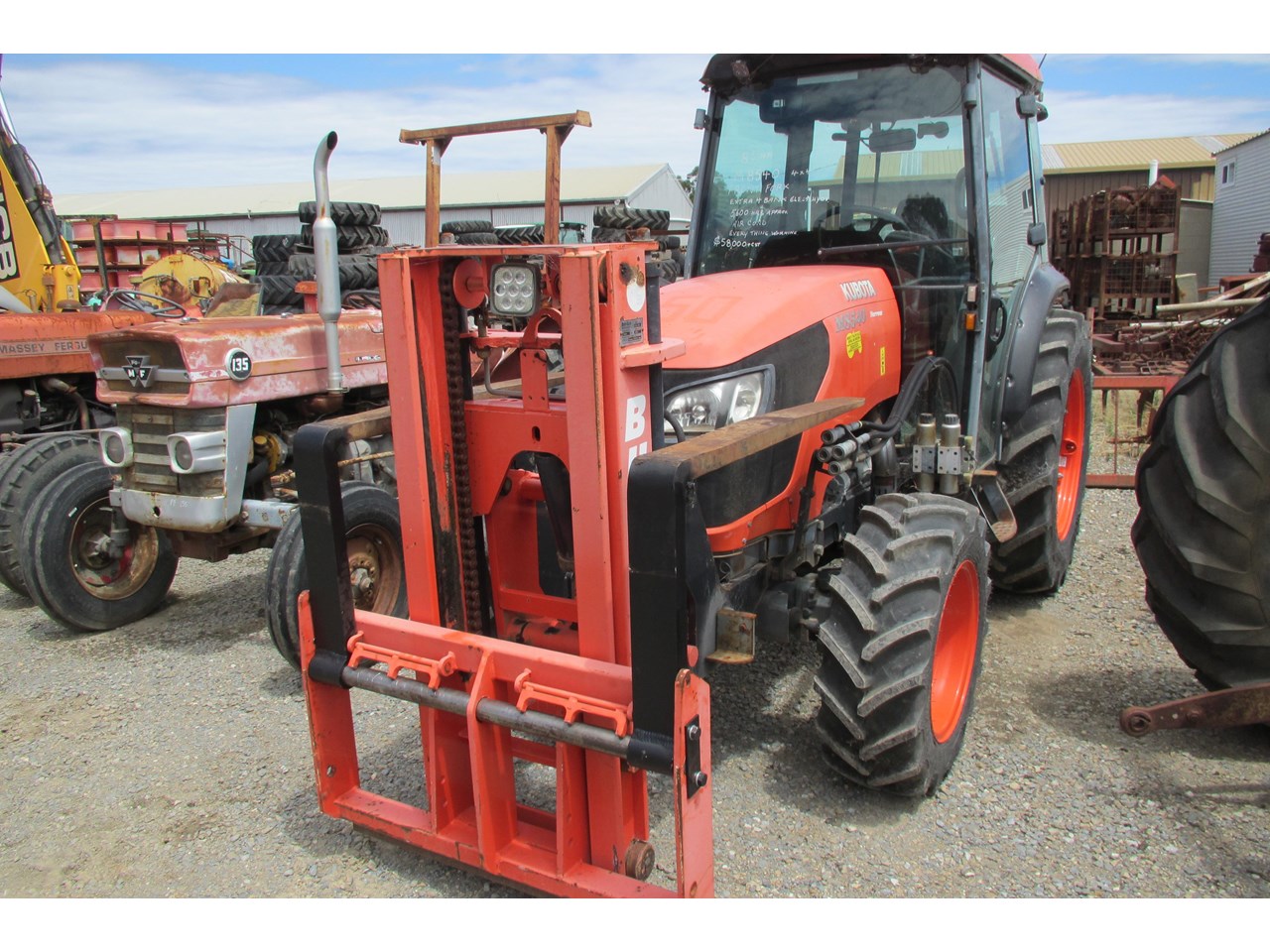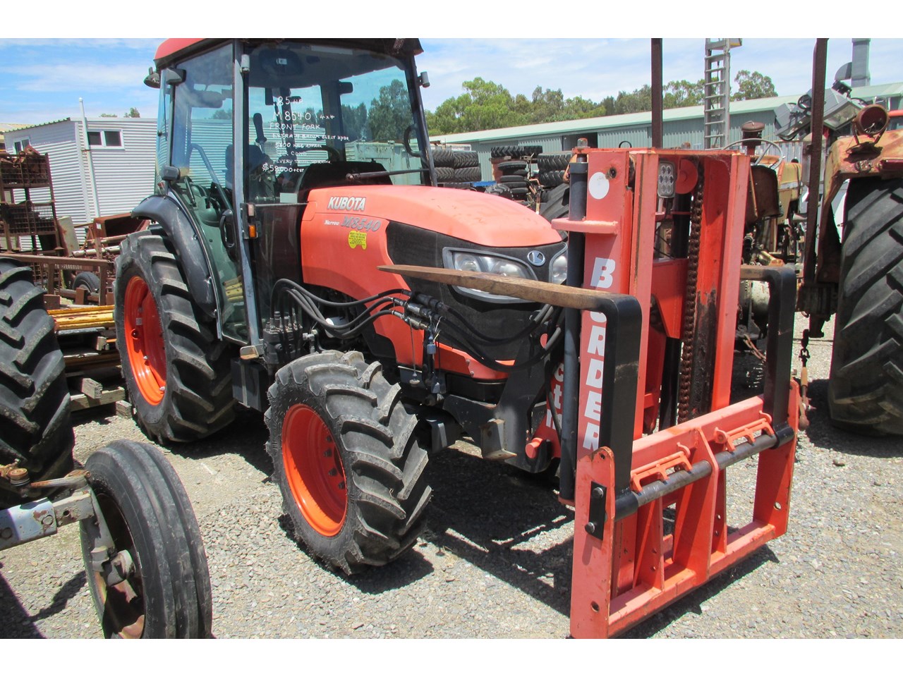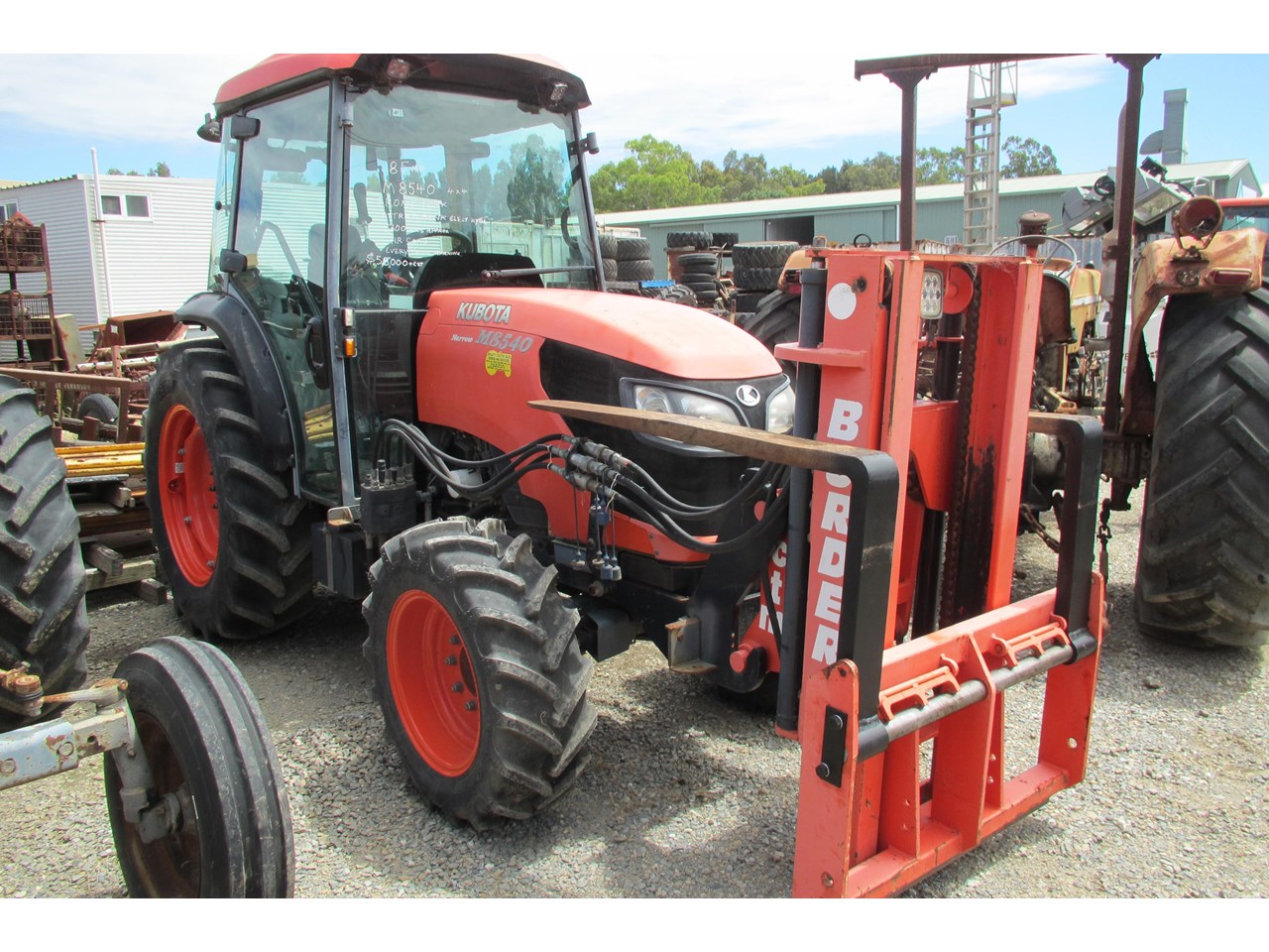 Kubota M8540 Tractor (Narrow), 4 wheel drive, with Front Fork Attachment & Front Tynes, 4 cylinder diesel turbo, extra 4 bank electric hydraulics, 85 horsepower approximately, air conditioning (working), approximately 5,700 hours indicated, engine no: 2DQ1454, serial no: 87908, ROPS