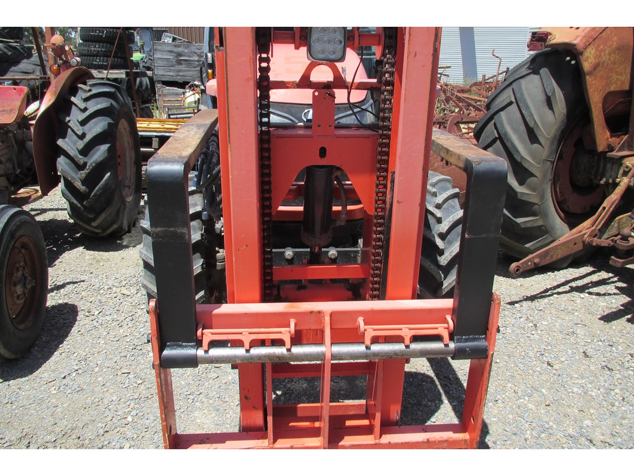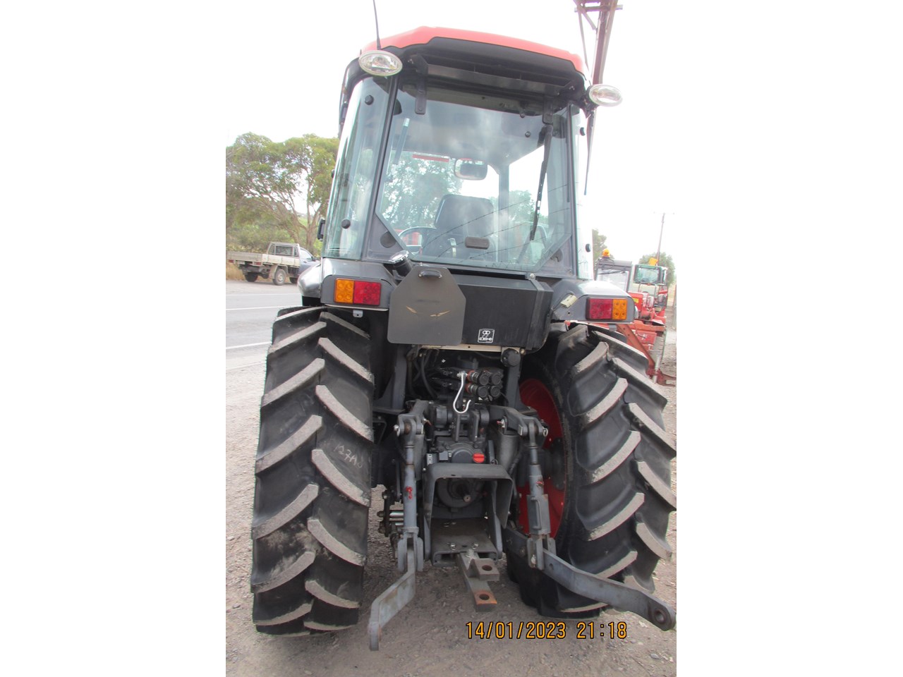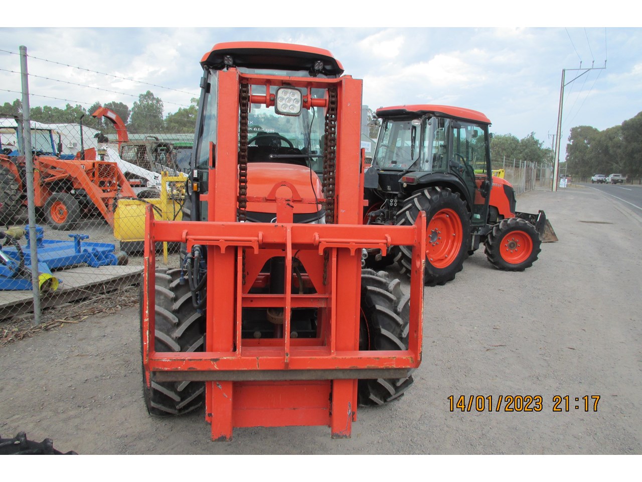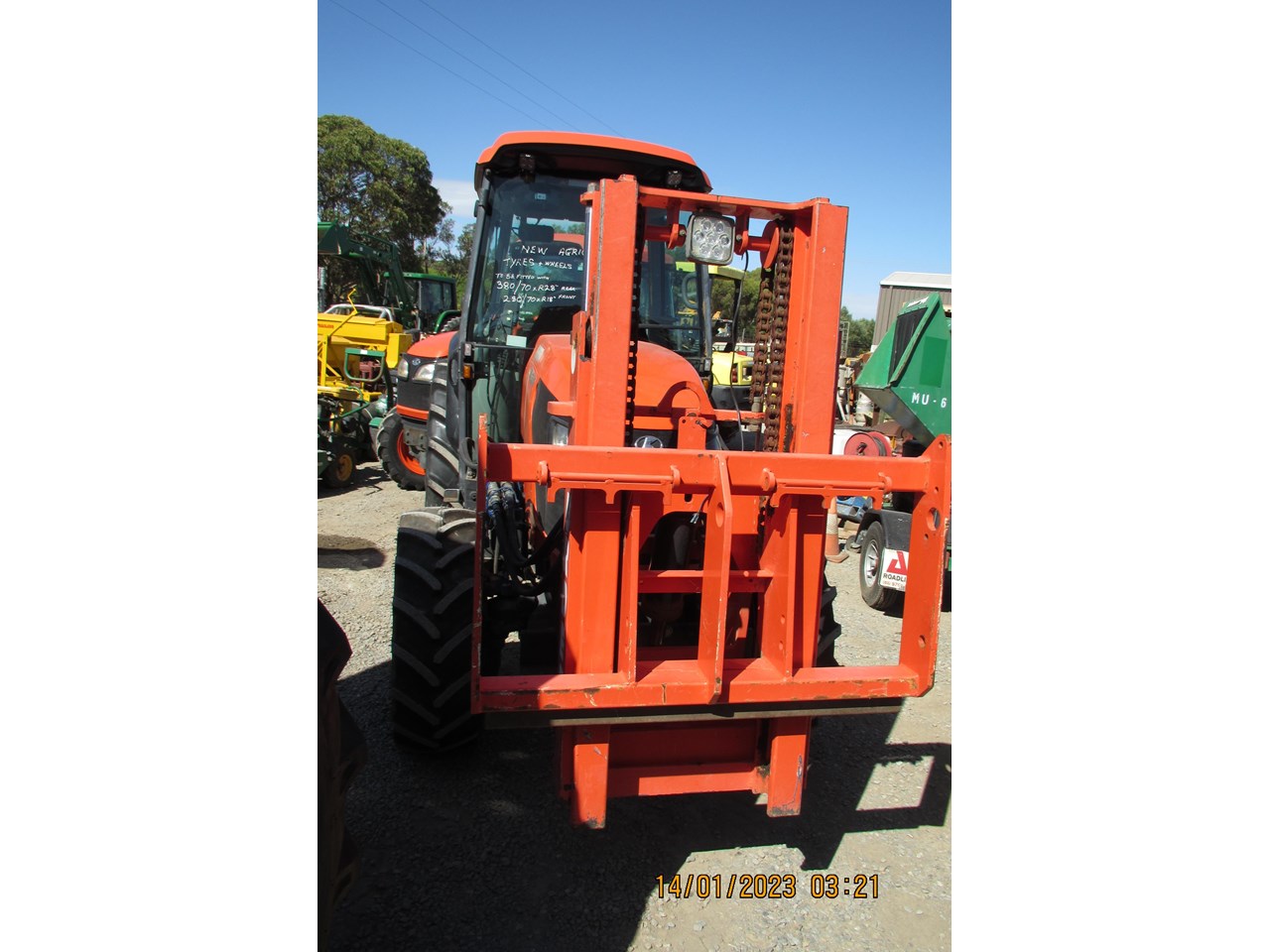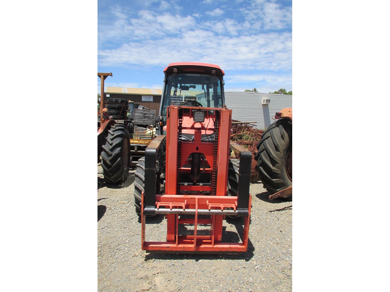 Kubota M8540 Tractor (Narrow), 4 wheel drive, with Front Fork Attachment & Front Tynes, 4 cylinder diesel turbo, extra 4 bank electric hydraulics, 85 horsepower approximately, air conditioning (working), approximately 5,700 hours indicated, engine no: 2DQ1454, serial no: 87908, ROPS